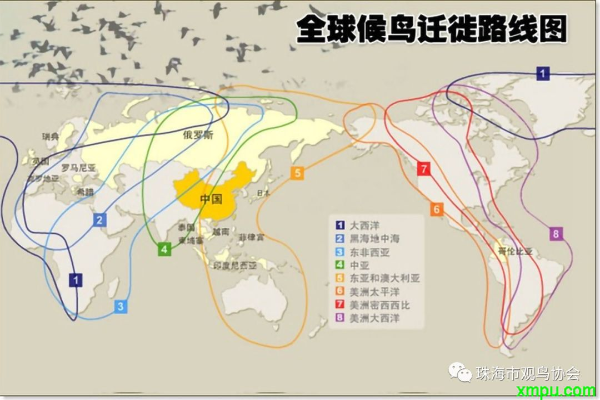 全球候鸟迁徙一共有8条路线。其中,第3、第4、第5条路线经过我国。“东非西亚迁徙线”的候鸟从蒙古进入新疆,跨越青藏高原后进入印度半岛,飞跃印度洋,最后在非洲落脚;“中亚迁徙线”从西伯利亚进入我国中部省份,最后在印度半岛繁衍生息;“东亚——澳大利亚迁徙线”则从美国阿拉斯加到澳大利亚西太平洋群岛,经过我国的东部沿海省份。