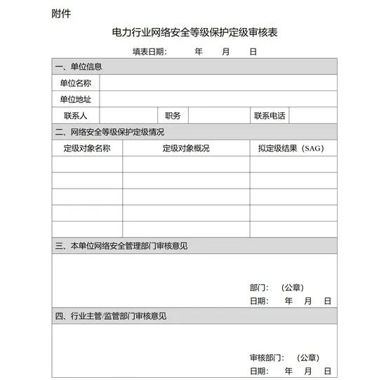 第九条 电力企业办理网络安全等级保护定级审核手续时,应当提交《电力行业网络安全等级保护定级审核表》(详见附件),含各定级对象的定级报告及专家评审意见。