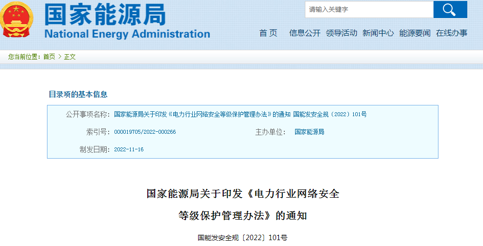 12月12日,国家能源局发布《电力行业网络安全等级保护管理办法》。