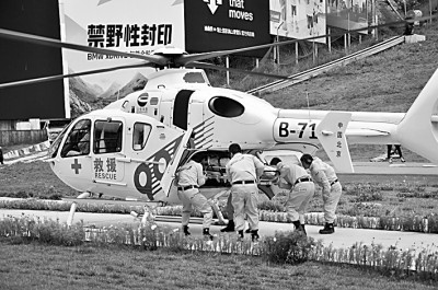 京津冀红十字应急救护救援演练活动日前在河北张家口举行,图为救援直升机搭载模拟伤员成功起飞。贺晔摄/光明图片