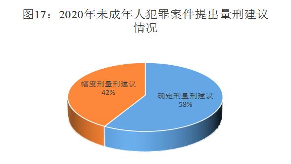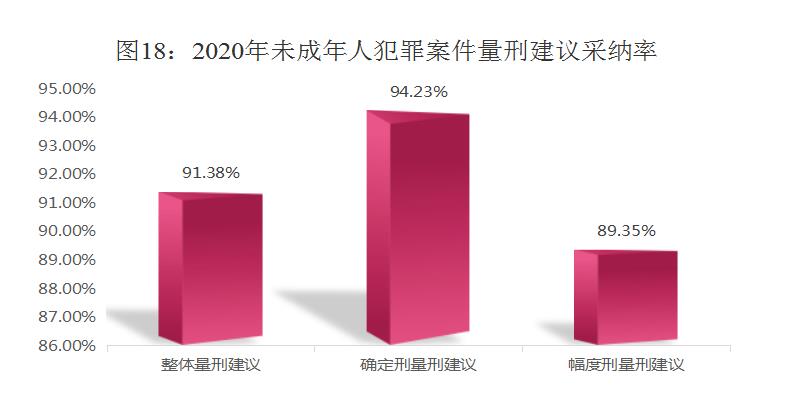7.确定刑量刑建议采纳率高。2020年检察机关针对未成年人犯罪提出量刑建议26056人,其中确定刑量刑建议15194人,幅度刑量刑建议10862人,分别占58.31%、41.69%。量刑建议采纳23809人,采纳率91.38%,其中确定刑、幅度刑量刑建议分别采纳14318人、9671人,采纳率分别为94.23%和89.35%,确定刑量刑建议采纳率更高,效果更好。