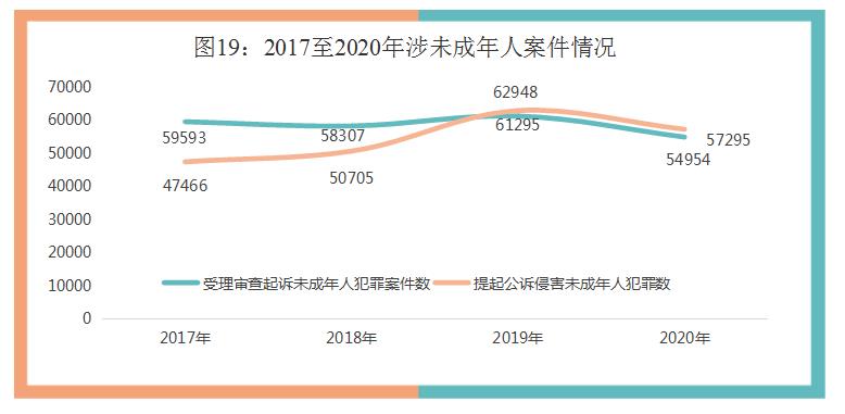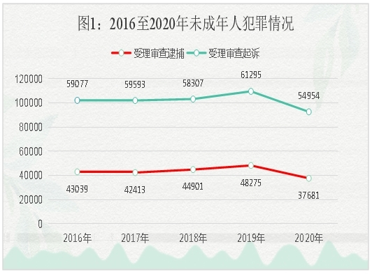 2020年,全国检察机关共受理审查逮捕未成年犯罪嫌疑人37681人,受理审查起诉54954人,批准逮捕22902人,不批准逮捕14709人,提起公诉33219人,不起诉16062人(含附条件不起诉考验期满后不起诉人数),不捕率、不诉率分别为39.1%和32.59%。同时,共批准逮捕侵害未成年人犯罪38854人,提起公诉57295人。《白皮书》介绍,未成年人犯罪数量下降幅度较大,升降态势与疫情防控形势关联较大。继2019年受理审查逮捕、审查起诉未成年犯罪嫌疑人同比上升7.51%、5.12%之后,2020年同比分别下降21.95%、10.35%,为五年来最低。