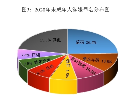2.七类犯罪占比超八成。2020年受理审查起诉未成年人犯罪居前七位的分别是盗窃14405人、聚众斗殴7406人、寻衅滋事5728人、强奸5160人、抢劫4968人、故意伤害4167人、诈骗4042人,七类犯罪嫌疑人数量占全部犯罪人数的84.03%,与2019年基本持平。