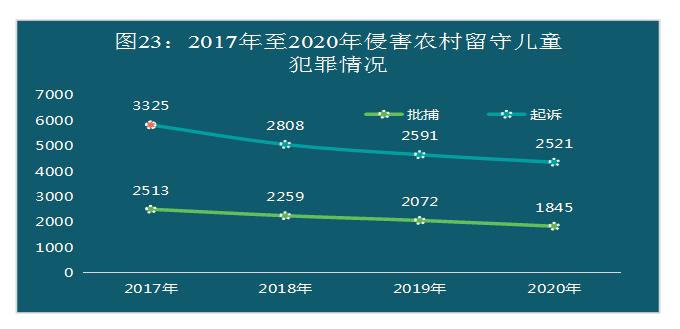 4.侵害农村留守儿童犯罪数量持续下降。2017年至2020年,检察机关批准逮捕侵害农村留守儿童犯罪分别为2513人、2259人、2072人、1845人,同比下降10.11%、8.28%、10.96%,起诉侵害农村留守儿童犯罪分别为3325人、2808人、2591、2521人,同比下降15.55%、7.73%、2.7%,反映农村留守儿童保护工作成效进一步提升。