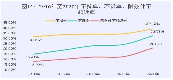 1.未成年人犯罪不捕率明显上升。2016年至2020年,未成年人犯罪不捕率逐年上升,分别为31.66%、33.59%、34.13%、34.43%、39.1%,2020年上升幅度达4.7个百分点,未成年人少捕政策进一步落实。从不捕原因看,2016年以来,因无社会危险性不捕人数呈增多态势,分别为8081人,8769人、9666人、10693人、10415人,占不捕人数的比例分别为59.48%、61.65%、63.57%、64.61%、70.81%,2020年同比上升6.2个百分点;因证据不足和不构成犯罪等原因不捕的比例进一步降低,反映司法理念和办案质量进一步提升。