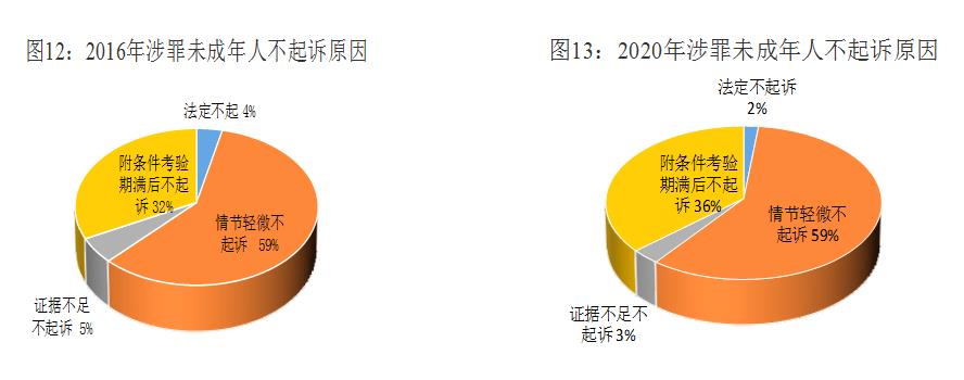 2.未成年人犯罪不诉率大幅上升。2016年至2020年,检察机关分别对未成年犯罪嫌疑人不起诉8106人、10114人、11865人、13752人、16062人,不起诉率分别是15.01%、18.84%、22.99%、24.13%、32.59%,2020年同比上升8.46个百分点。从不起诉原因看,2020年法定不起诉292人,情节轻微不起诉9410人,证据不足不起诉507人,附条件不起诉考验期满后不起诉5853人,与2016年相比,法定不起诉和因证据不足不起诉占比均有所降低,司法理念进一步更新。