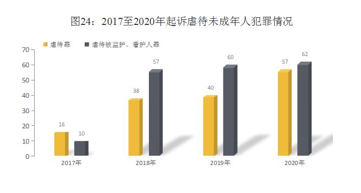 5.监护侵害中虐待犯罪问题不容忽视。2017年至2020年,检察机关以虐待罪起诉侵害未成年人犯罪分别为16人、38人、40人、57人,以虐待被监护、看护人罪起诉侵害未成年人犯罪分别为10人、57人、60人、62人,反映打击力度加大、强制报告制度落实取得初步成效。