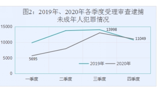 1.未成年人犯罪数量下降幅度较大,升降态势与疫情防控形势关联较大。继2019年受理审查逮捕、审查起诉未成年犯罪嫌疑人同比上升7.51%、5.12%之后,2020年同比分别下降21.95%、10.35%,为五年来最低。从2020年各季度看,受理审查逮捕未成年犯罪嫌疑人数分别为5695人、7941人、12996人和11049人,前三季度同比分别下降42.09%、42.08%、7.16%,第四季度有所反弹,同比上升2.95%,与疫情形势及防控要求紧密相关,即疫情防控严格,社会接触时间、空间缩小,犯罪活动相应受到限制。