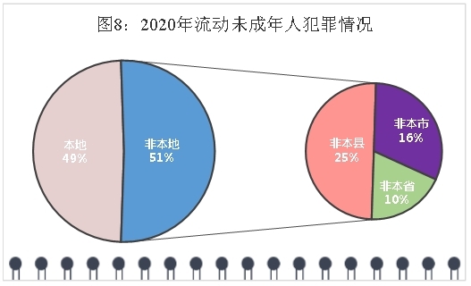 7.流动未成年人犯罪占比超一半。2020年,各地检察机关受理审查起诉未成年人犯罪案件中非本县13923人、非本市8729人、非本省5213人,占全部受理审查起诉人数的50.71%,反映出加强流动未成年人管理、教育工作非常重要和迫切。