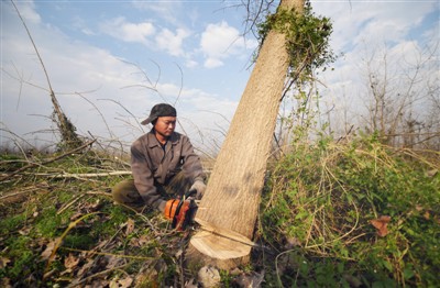 2017年11月27日,南洞庭湖自然保护区核心区内,一名工作人员在清理欧美黑杨。新华社记者 李尕 摄