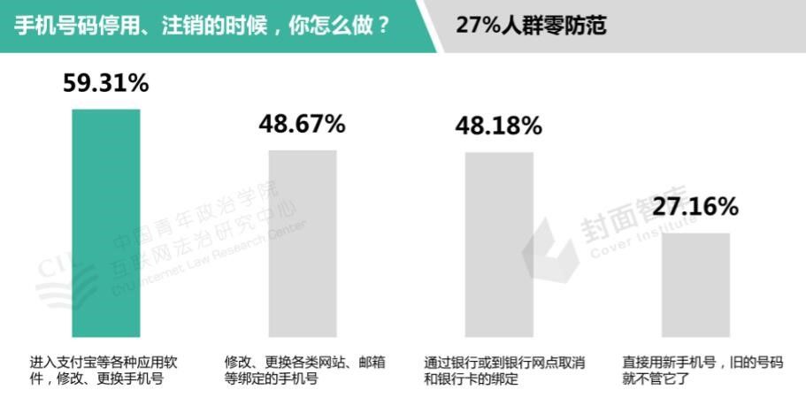 在更换手机时,更能确保个人信息安全的方法是将手机恢复出厂设置或格式化后,再用无关内容将手机存储空间占满后再予处理,但仅有34%的参与调研者选择了这一选项,有17%的参与调研者选择将手机直接送人;在手机换号时,超过27%的参与调研者选择直接使用新号码,而不对旧号码采取任何措施(见图9)。