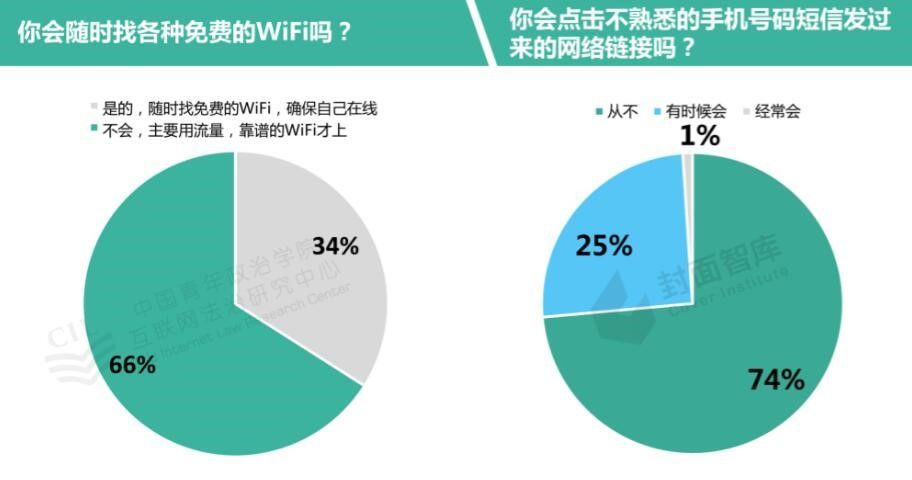 在通过手机使用Wi-Fi时,34%的参与调研者只希望确保手机在线,而不会对免费Wi-Fi鉴别使用;在收到陌生号码发来的短信时,26%的参与调研者会点击短信中的可能产生侵害行为的网络链接(图7)。