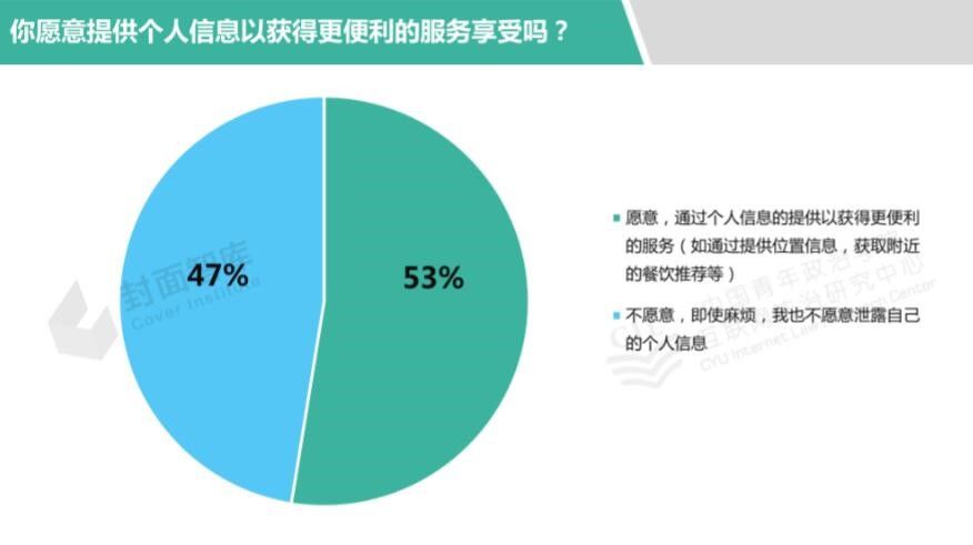 值得关注的是,当被问及是否“愿意提供个人信息以获得更便利的服务享受”时,更多的人选择了“愿意”(图12)。这也充分说明,信息共享带来的便利是客观存在的,多数人并不赞同为保护隐私而过分限制信息流动。