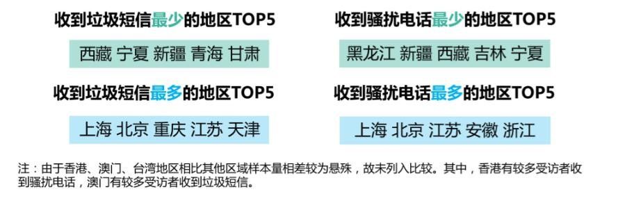 在全国分布角度,来自西藏、宁夏、新疆、青海、甘肃等省区的参与调研者收到垃圾短信最少,来自上海、北京、重庆、江苏、天津等省市的参与调研者收到垃圾短信最多;在骚扰电话方面,最少的省区是黑龙江、新疆、西藏、吉林、宁夏,最多的省市是上海、北京、江苏、安徽、浙江(见图4)。总体上看,越是经济发达、社会网络化、信息化程度高的地区,电信骚扰密度越高。