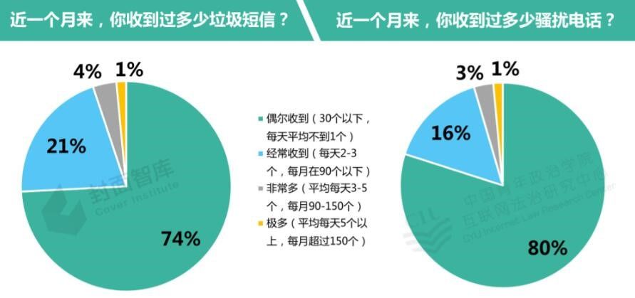垃圾短信和骚扰电话是个人信息泄露所引发的电信骚扰及诈骗行为。参与调研者中,26%每天收到2个以上的垃圾短信,20%近一个月来每天收到2个以上骚扰电话(见图3)。