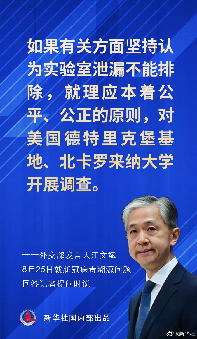 1.外交部:中方向世卫组织提出调查德特里克堡 中国常驻日内瓦代表陈旭24日致函世卫组织总干事谭德塞,并递交两份非文件,以及超过2500万中国网民联署要求调查美国德特里克堡基地的公开信。对此,外交部发言人汪文斌25日表示,中方始终支持并将继续参加科学溯源,如果美国顽固坚持实验室泄漏论,就应该首先邀请世卫组织去德特里克堡、北卡罗来纳大学进行溯源调查。(新华社)