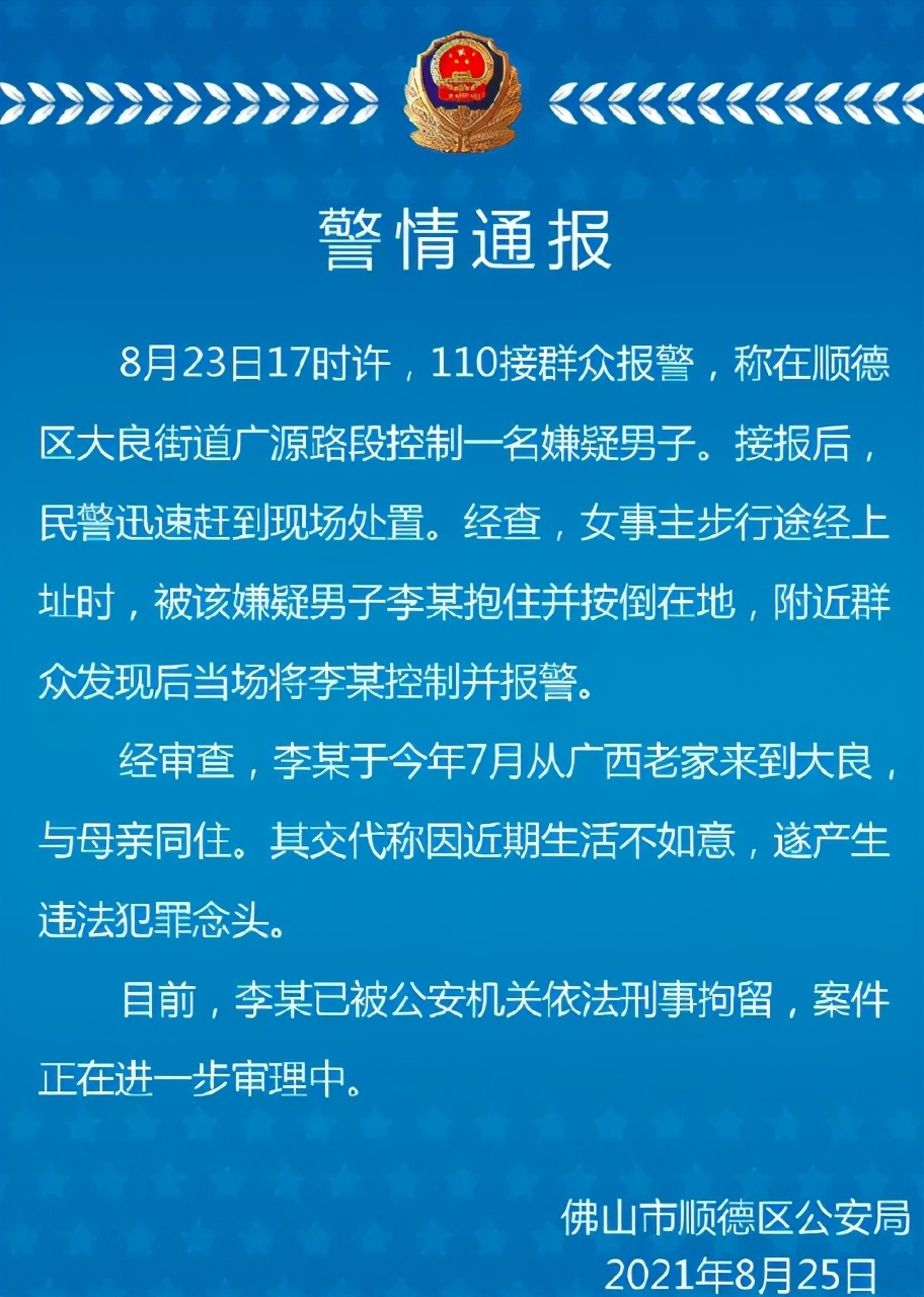 近日,广东佛山街头一女子在路上正常行走时,突然被一白衣男子抱住强行按倒在地,撕扯衣服欲进行猥亵,女子挣扎呼救,附近群众听到后上前将该男子控制并报警。25日,佛山市顺德区公安局通报称,据嫌疑男子李某交代,因近期生活不如意,遂产生违法犯罪念头。目前,李某已被依法刑拘,案件正在进一步调查。(北京日报)