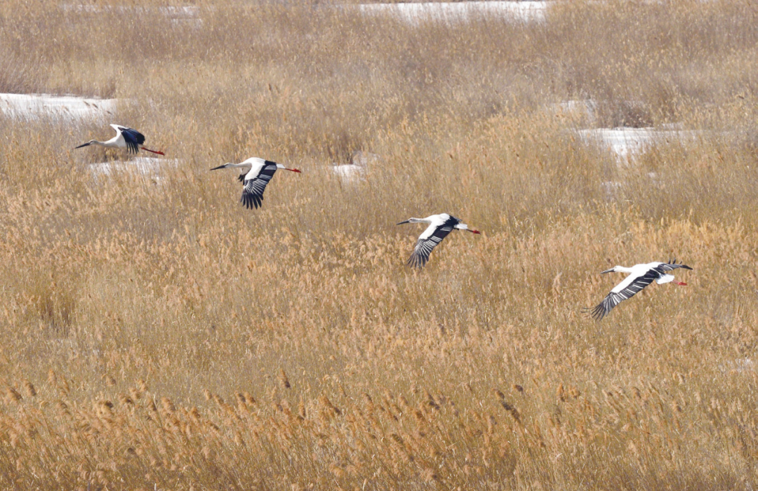 东方白鹳在万顷松江湿地中自由翱翔(陈文/摄)
