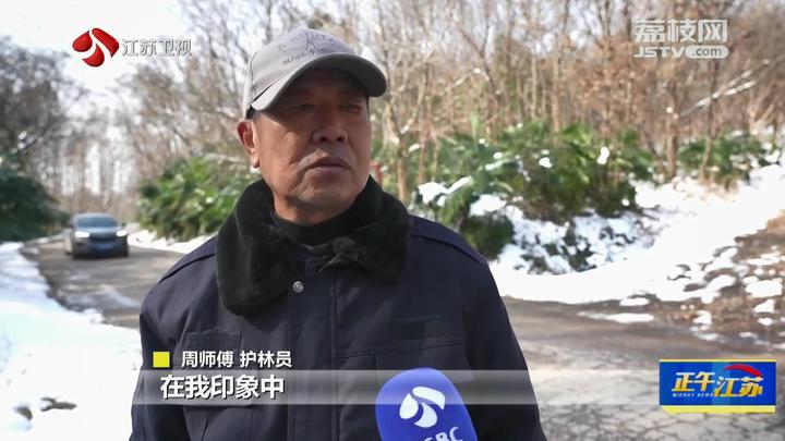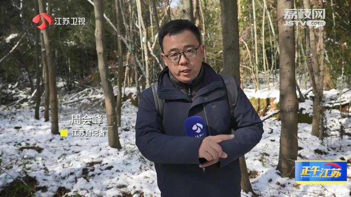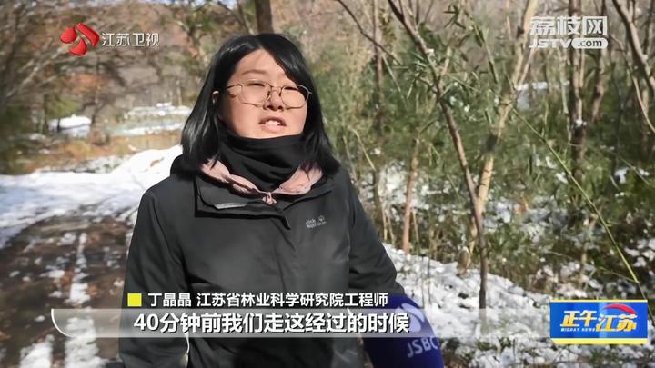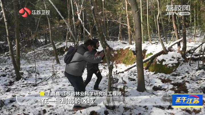 江苏省林业科学研究院工程师丁晶晶:“40分钟前我们走这经过的时候,这里还都是雪,这会我们从山上下来,就有很明显野猪活动的痕迹。他们应该是把树根什么的都翻上来了,可能是一群或者几只野猪从这里经过。”