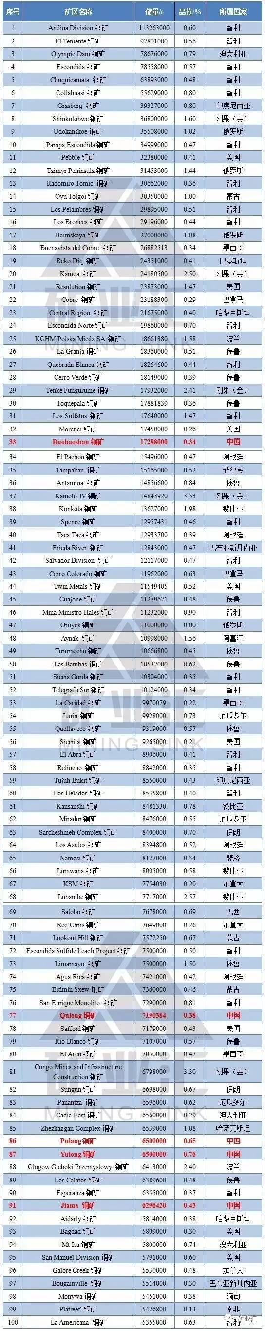 附:全球规模最大(储量)的100座铜矿(都达到了大型规模)