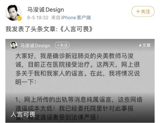 马某在说明中表示,他在回京途中不幸被感染,“我现在一直在发烧,39度多,没精力去关注这些网络谣言。但这些谣言已经严重影响到我和我的家庭。”因涉嫌编造“某高校教授携妻子闺蜜去三亚旅游确诊新冠肺炎”的虚假信息,嫌疑人葛某飞被北京西城公安分局依法采取刑事强制措施。