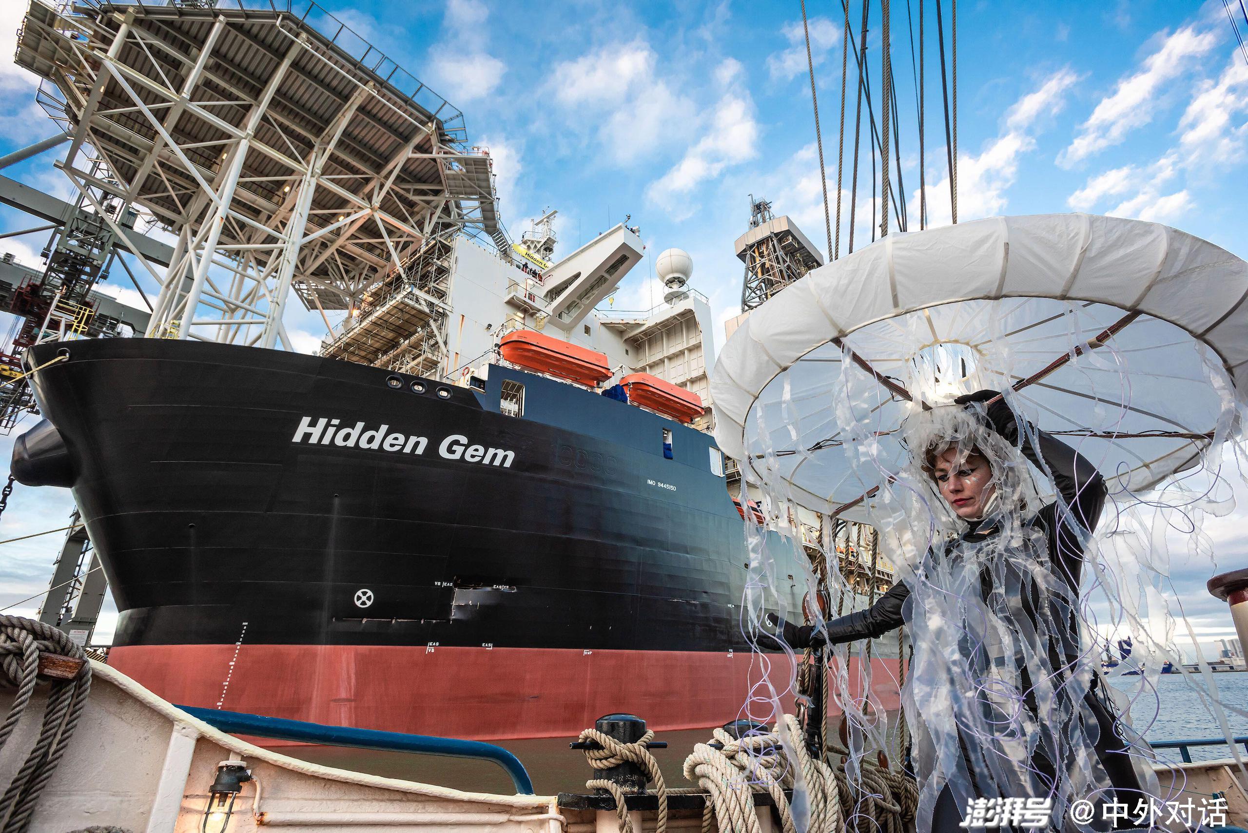 “隐藏宝石号”(Hidden Gem)工业钻探船旁的抗议者。去年9月,“隐藏宝石号”成为首艘经国际海底管理局授权在太平洋克拉里昂-克利珀顿区测试采矿设备的船只。图片来源:Charles M. Vella / Alamy