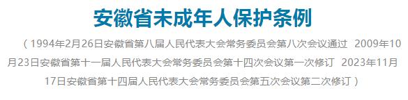 《安徽省未成年人保护条例》已经2023年11月17日安徽省第十四届人民代表大会常务委员会第五次会议修订通过,现予公布,自2024年1月1日起施行。