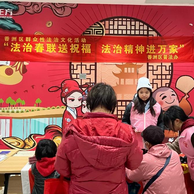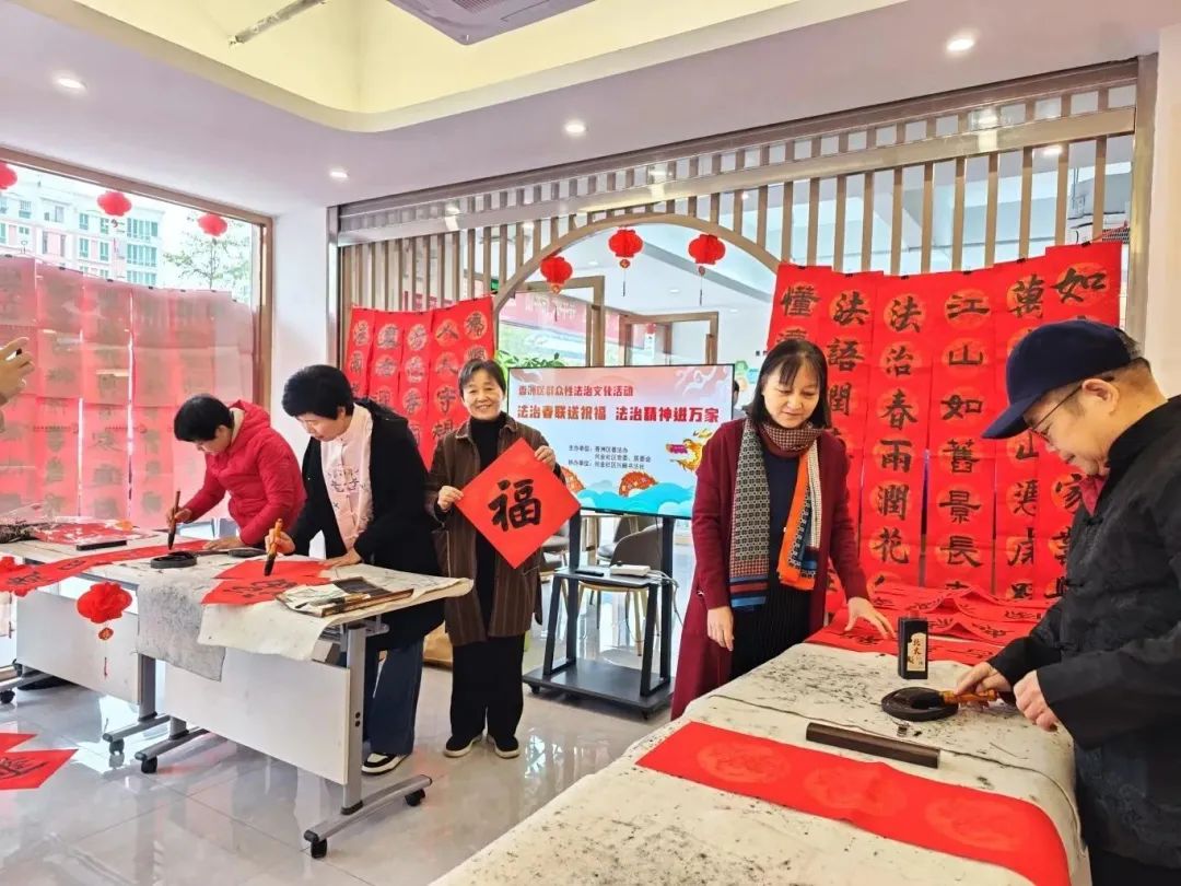 香洲区普法办联合各司法所在联安社区、兴业社区、作物社区等举办以“法治春联送祝福,法治精神进万家”为主题的群众性法治文化活动,为到场群众现场书写法治春联。