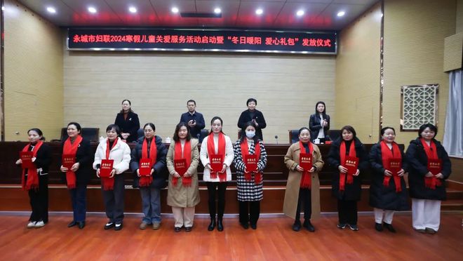 1月26日,永城市妇联2024寒假儿童关爱服务活动启动暨“冬日暖阳 爱心礼包”发放仪式,给爱心爸爸、爱心妈妈代表颁发了荣誉证书,为受捐儿童代表发放了大礼包,本次活动共捐赠大礼包200个。