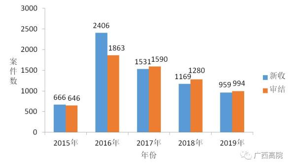 图4 2015-2019年全区法院环境资源类行政案件新收和审结情况图