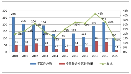 图二:2010年至2020年第三季度北京一中院受理的公司类纠纷关联案件情况