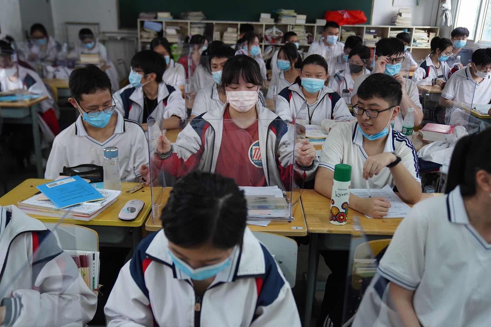 2020年7月10日,武汉,学校在课桌上放置了透明小隔板,为了保持学生之间坐在课桌前的社交距离。人民视觉 图