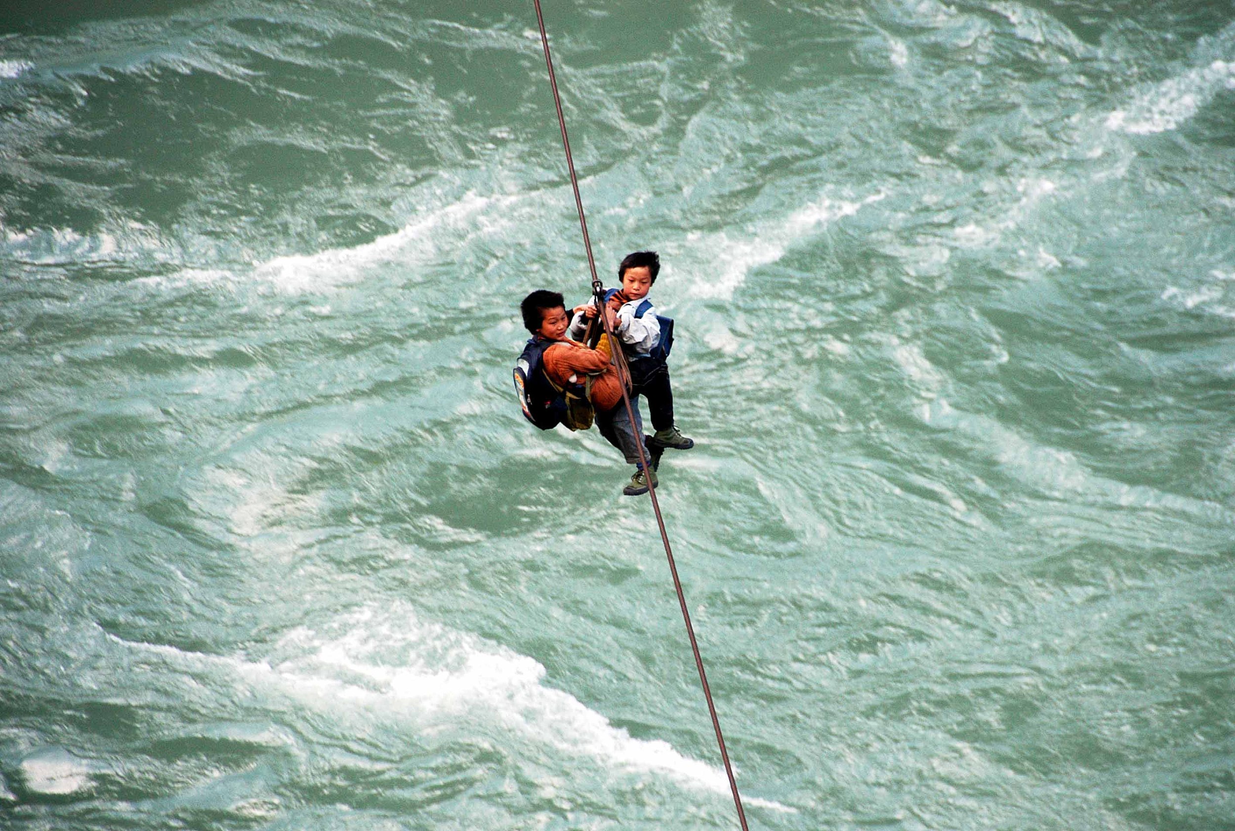 2007年12月,云南怒江,马吉乡中心小学兄弟俩飞索过江上学。人民视觉 图