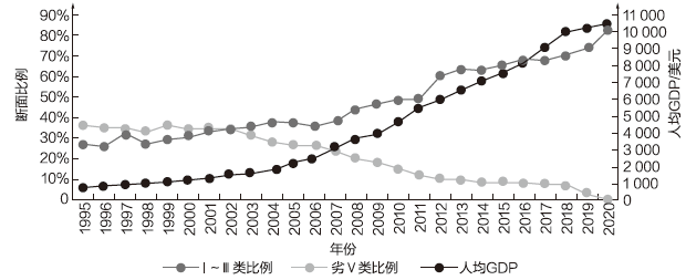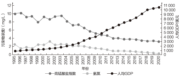 总体上,我国采取“水污染物排放总量、水环境质量”双约束和“抓好差两头、带动中间水体”的水质保护思路,根据《中国环境状况公报》《中国统计年鉴》等,1995—2020年,全国人均GDP增加了12.7倍,全国地表水Ⅰ~ Ⅲ类比例增加56.0个百分点,劣Ⅴ类比例降低35.9个百分点();主要污染物浓度大幅降低,全国地表水国控断面高锰酸盐指数、氨氮浓度分别下降了67.8%、90.8%()[]。
