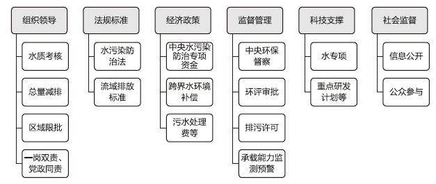 2.3 保障措施:水污染防治政策机制逐步健全完善解决水污染问题要运用系统性思维,重点流域水污染防治规划除针对性地设计任务和项目等工程性措施外,还应用法规标准、政策制度和组织实施机制等非工程举措保障水污染治理任务顺利实施。20世纪80年代环境管理领域建立的“三大政策”和“八大制度”是各时期水污染防治工作的基础性环境管理制度,但随着水污染防治工作的不断推进,主要矛盾发生变化,流域规划实施的政策保障体系得到不断创新和完善。20多年水污染防治实践表明,我国建立了较为系统全面、日渐成熟的水污染防治政策管理体系[-]()。一是组织机制更加明确。落实《党政领导干部生态环境损害责任追究办法(试行)》要求,自“十一五”起以重点流域水污染防治专项规划实施考核为抓手,依据《中华人民共和国水污染防治法》落实地方政府治污责任,打好治理“组合拳”、多部门合力治污,推动落实“党政同责、一岗双责”;以排污许可落实企业治污责任。二是法规标准更加严密。严格环境执法监管,强化《中华人民共和国水污染防治法》等制度执行,2017年《中华人民共和国水污染防治法》修正案颁布施行,补充饮用水保护、限期达标规划等有关规定;形成了质量标准与排放标准、国家与地方“两类两级”的水环境标准体系,并在山东、河北、河南等多个省份制定一些流域或区域性的排放标准。三是经济政策更加健全。20多个省份在跨省流域、省内跨地市等流域实施跨界生态补偿政策;中央水污染防治专项资金加大投入,2020年达到220亿元;按照补偿污水处理和污泥处置成本并合理盈利的原则,制定调整污水处理收费标准,尽可能做到应收尽收,并按规定足额核拨污水处理费,以保障污水处理厂正常经营。四是科技支撑更加有力。组织实施“水体污染控制与治理”国家科技重大专项,推动湖泊生态修复、流域水质水量综合调控等一批先进适用重大科技成果落地转化。五是监督管理更加有效。中央生态环境保护督察制度由“督企”向“督政”转变,有力推动“党政同责、一岗双责”落实,统一标准、联合执法、联合治污、信息共享等流域协作机制进一步完善。六是公众参与更加广泛。依法公开环境信息,每年开展城市水环境质量排名,畅通“12369”环保热线、微信、网络等举报渠道,接受社会监督。