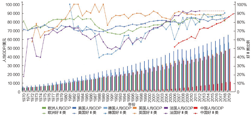 三项指标的水质评价结果显示,2019年我国Ⅰ ~ Ⅲ类比例为85.6%,美国、德国、英国、法国、欧洲(英国、法国、德国等38个国家)平均分别为85.7%、90.1%、88.3%、92.5%、80.6%(其结果受数据的可获取性影响)()[, ];从1970—2019年各国水环境质量变化趋势看,我国近10多年的水质改善速度远超欧美发达国家水平,在某种程度上我国用10多年的时间,水质理化指标基本实现与发达国家相当。