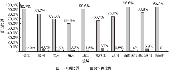 3.2.1 水环境质量:与发达国家基本相当在水环境质量监测和评价方面,国际上尚未形成统一的水环境质量监测评价体系。各个国家采用的水质评价指标及水质标准有所差别和不同,通常是以基准或相关标准为依据,考虑社会、经济和技术等发展状况,经过综合分析制定水环境质量标准的管理限值。开展水环境状况比较,首先要选择可比的相关指标进行分析,本文以我国现行的《地表水环境质量标准》(GB3838—2002)中指标为基础,兼顾其他发达国家在水生态环境改善进程中也普遍监测和评价的指标,研究确定溶解氧、生化需氧量和总磷等作为可比的理化指标,按照《地表水环境质量标准》(GB3838—2002)进行统一评价。