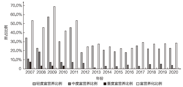 与此同时,百姓反映强烈的、影响城市人居环境的黑臭水体逐渐被整治、消除,群众获得感明显增强。截至2020年底,全国295个地级及以上城市(不含州、盟)共有黑臭水体2914个,消除数量2863个,消除比例98.2%。此外,重要湖泊(水库)富营养化趋势得到一定程度遏制,1996年监测的26个重要湖泊(水库)中富营养化比例高达85%,其中东部湖泊全部呈现富营养化状态[];2020年,全国开展营养状态监测的110个重要湖泊(水库)中,轻度、中度、重度富营养状态分别为23.6%、4.5% 和0.9%()。