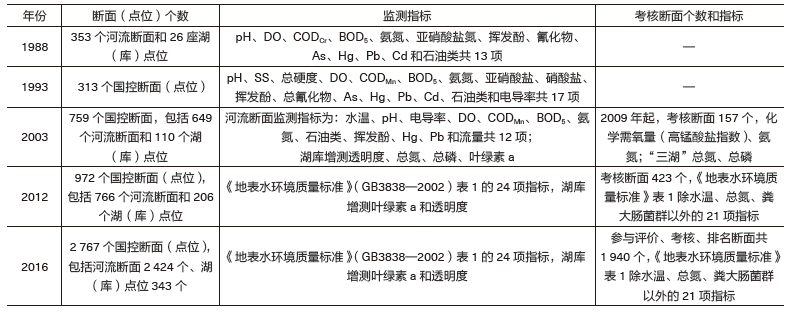 2.1 质量改善:“保好水、治差水”取得明显进展为更好地适应生态环境保护管理要求,反映全国地表水环境质量状况及其变化趋势,我国在20世纪80年代初建立了国家地表水环境质量监测网并逐步发展完善,水环境质量监测断面与监测指标逐步扩展,形成了手工采样、实验室分析、水质自动站相结合的监测方式;根据《地表水环境质量标准》(GB3838— 2002),水环境质量评价指标由早期的9项指标扩展至21项指标(),逐步关注水环境质量的全面改善;监测断面由“十一五”的759个断面发展到“十二五”的972个断面[]、“十三五”的2767个断面[],再到“十四五”的3646个断面,全面反映全国地表水水质状况。与水环境质量监测体系相匹配的是,每一期重点流域水污染防治规划均制定了饮用水水源地等高功能水体、水质良好水体、污染严重水体等相关规划断面及水质目标要求。