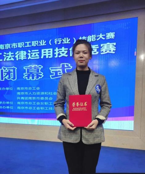 陈静怡同志通过参加浦口赛区选拔赛、南京市女职工法律运用技能竞赛初赛,经过层层角逐入围决赛。在决赛现场通过自我介绍、简答题、案例题陈述、专家点评等环节与其他参赛选手进行了激烈角逐,充分展现了我院巾帼风采,最终荣获三等奖,并将由市总工会授予“南京市五一创新能手”称号,团市委授予“南京市岗位能手”称号。