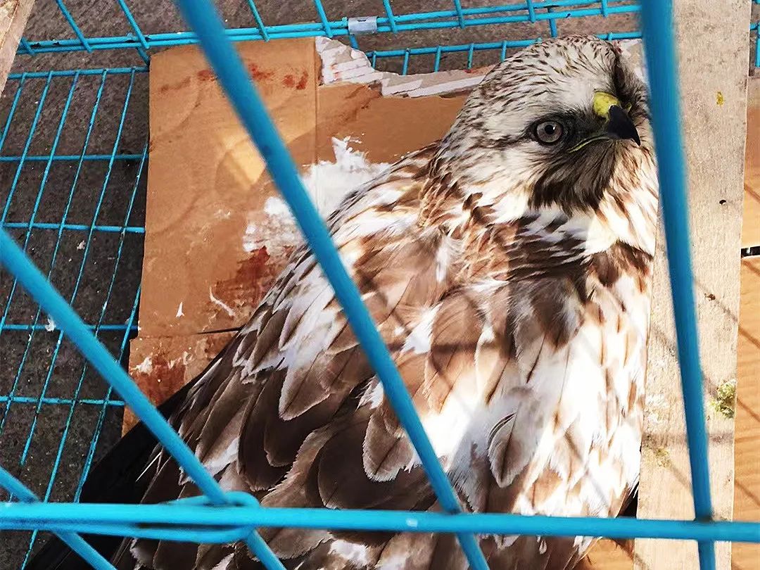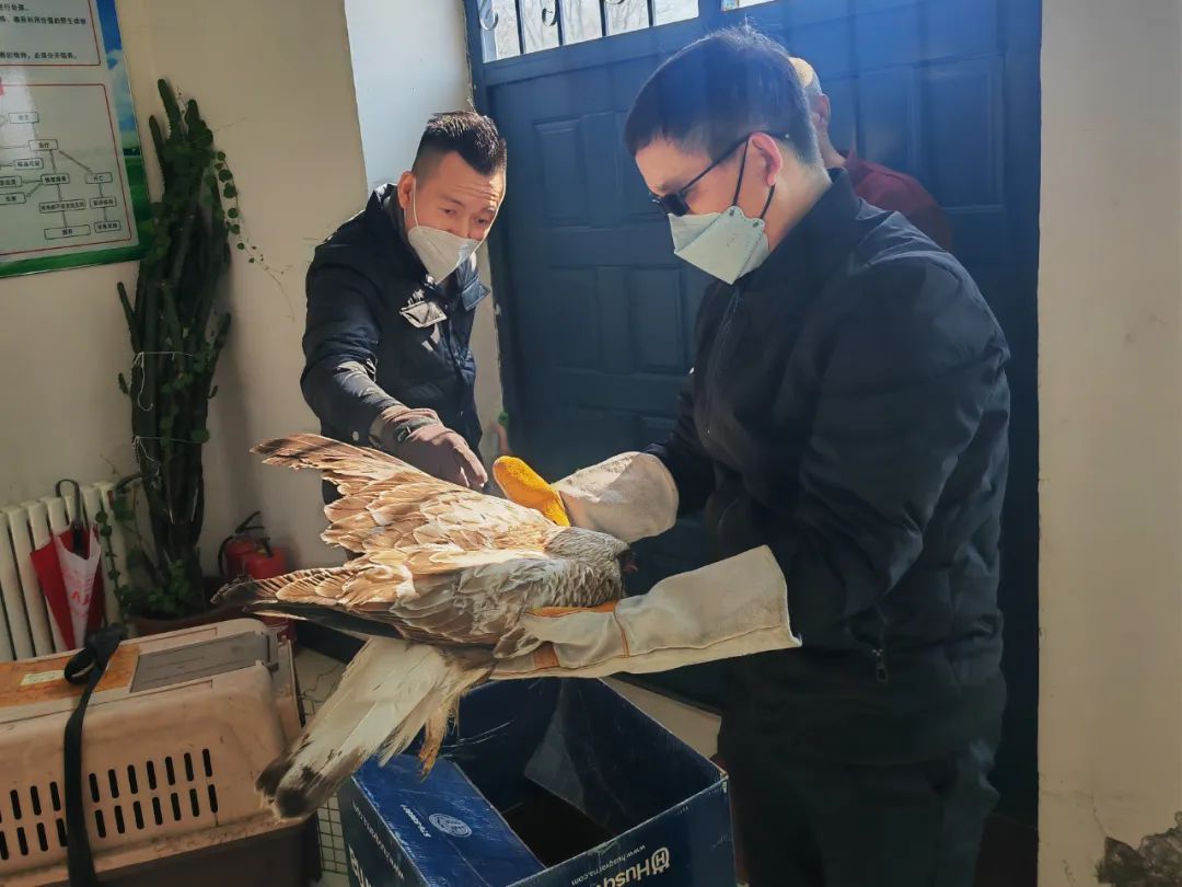 林草局野生动植物保护股工作人员接到通知后,立即前往村民所述地点,到达所述地点后,经现场确认,此鸟为国家二级保护动物——毛脚鵟,一只翅膀已经受伤,生命体征极不稳定。