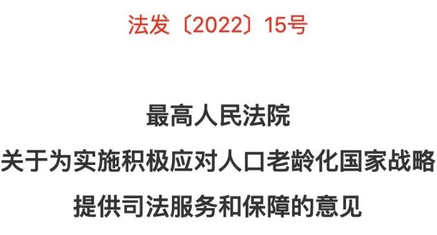 为全面贯彻落实《中共中央、国务院关于加强新时代老龄工作的意见》,深入贯彻积极应对人口老龄化国家战略,充分发挥审判职能作用,切实提升广大老年人的获得感、幸福感、安全感,现结合工作实际,就人民法院服务和保障实施积极应对人口老龄化国家战略提出如下意见。