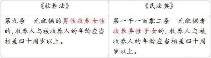 《民法典》第一千零九十八条结合我国的二胎政策,将收养人的条件从“无子女”扩大到“无子女或者只有一名子女”,拓宽了收养人的范围,与现行人口政策一致,有利于促进更多的孤儿被收养,回归到正常的家庭生活中。同时,增加了无不利于被收养人健康成长的违法犯罪记录的要求。如果收养人有违法犯罪的前科,可能会存在对被收养人不利的情况,该条对收养人条件加以限制,有利于避免此类情况发生。