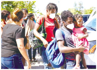 图为2021年9月24日,越过美墨边境的移民在美国得克萨斯州德尔里奥等待上车。 新华社发