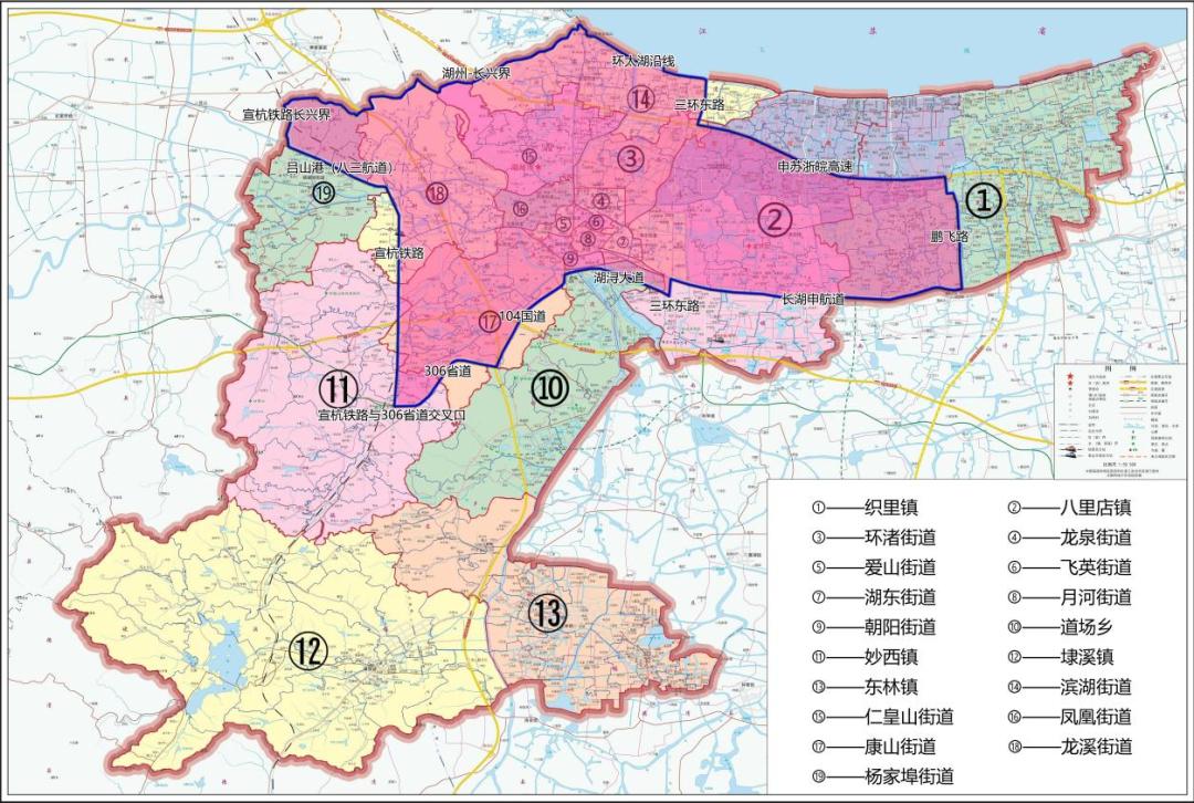 南至:306省道—104国道—湖浔大道—三环东路—长湖申航道;