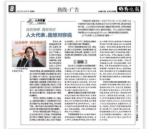 基于民呼我知、民呼我应,充分整合8181890新闻热线,人大、政协热线,市委留言,成立热线工作室,强化舆论监督,做到事事有回音,件件有着落。其中,《人大代表热线》为更好服务国家法治建设,2022年度共开通21次,共38名来自我市各界人大代表主持接听,并在《邯郸晚报》设立专门版面对热线受理、回复和督办情况及时报道。