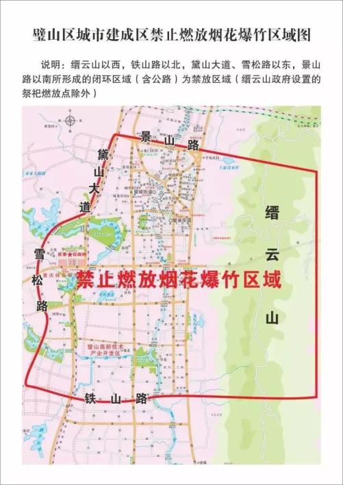 (一)城市建成区禁放区域:缙云山以西,铁山路以北,黛山大道、雪松路以东,景山路以南所形成的闭环区域(含公路)为禁放区域(缙云山政府设置的祭祀燃放点除外)。
