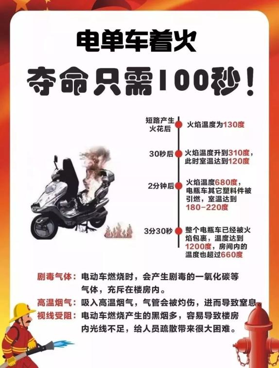 超过一半的电动车火灾都发生在夜间充电时间,很多车主为了省事,经常会在睡前将电动车放在楼道或者客厅整夜充电,凌晨至黎明这段时间往往是人们睡熟的时候,一旦发生火灾,很难及时发现,甚至来不及逃离。