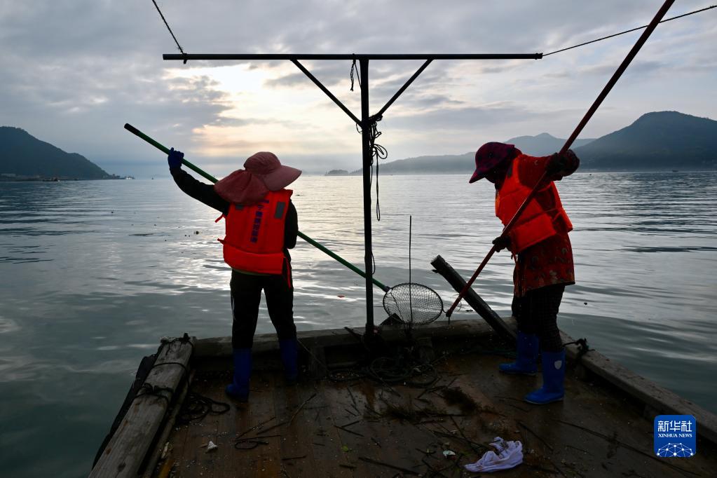 2021年6月1日,环卫工人在三都澳海域打捞海漂垃圾。近年来,福建省宁德市加强海漂垃圾综合整治工作,成立专业海上环卫公司,清理转运海岸线附近海域的海漂垃圾,保护海洋环境。新华社记者 姜克红 摄
