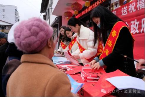 2月2日,道真自治县司法局、法宣办在平模镇开展“迎新春、送祝福、普法律、促和谐”主题法治宣传活动。普法志愿者为群众赠送法治宣传资料,细心解答群众法律咨询;书法老师挥毫泼墨,为群众现场书写法治春联,同时讲解法治春联的含义。“法治春雨润花红,正气春风吹柳绿”、“法若清风梳万物,德如化雨润千家”、“治国依法民心顺,理事照章社会安”、“尊法学法兴正气,守法用法建和谐”……一幅幅内容新颖、寓意美好、年味十足的法治春联送到群众手中,为群众增添了喜气祥和的新春气氛,将法治与文化有机结合并传递到寻常百姓家中,拉近了群众与法的距离,朴素的法治理念也将融入群众心中,伴随他们进入新的一年。此次活动,共发放民法典、宪法、法律援助、预防网络诈骗等法治宣传资料700余份,赠送法治春联300余幅。
